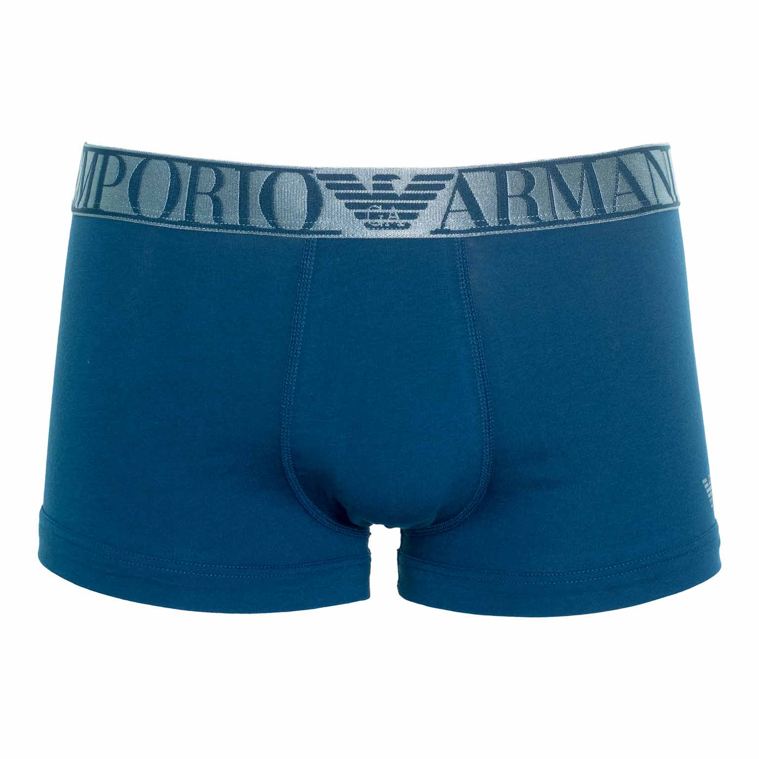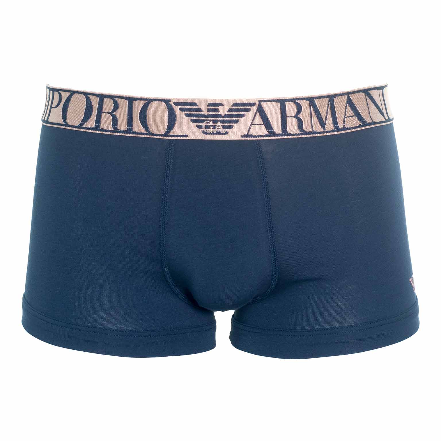 Deze trunk van Emporio Armani gemaakt van stretch katoen met een iriserende tailleband met het Emporio Armani logo, voor een chique opvallende look. De trunk heeft korte pijpjes en heeft een comfortabele snit met extra ondersteuning voor de billen. Deze luxe trunk siert zich door eenvoud door de uitvoering in een unikleur met links voor in het klein het Armani logo.