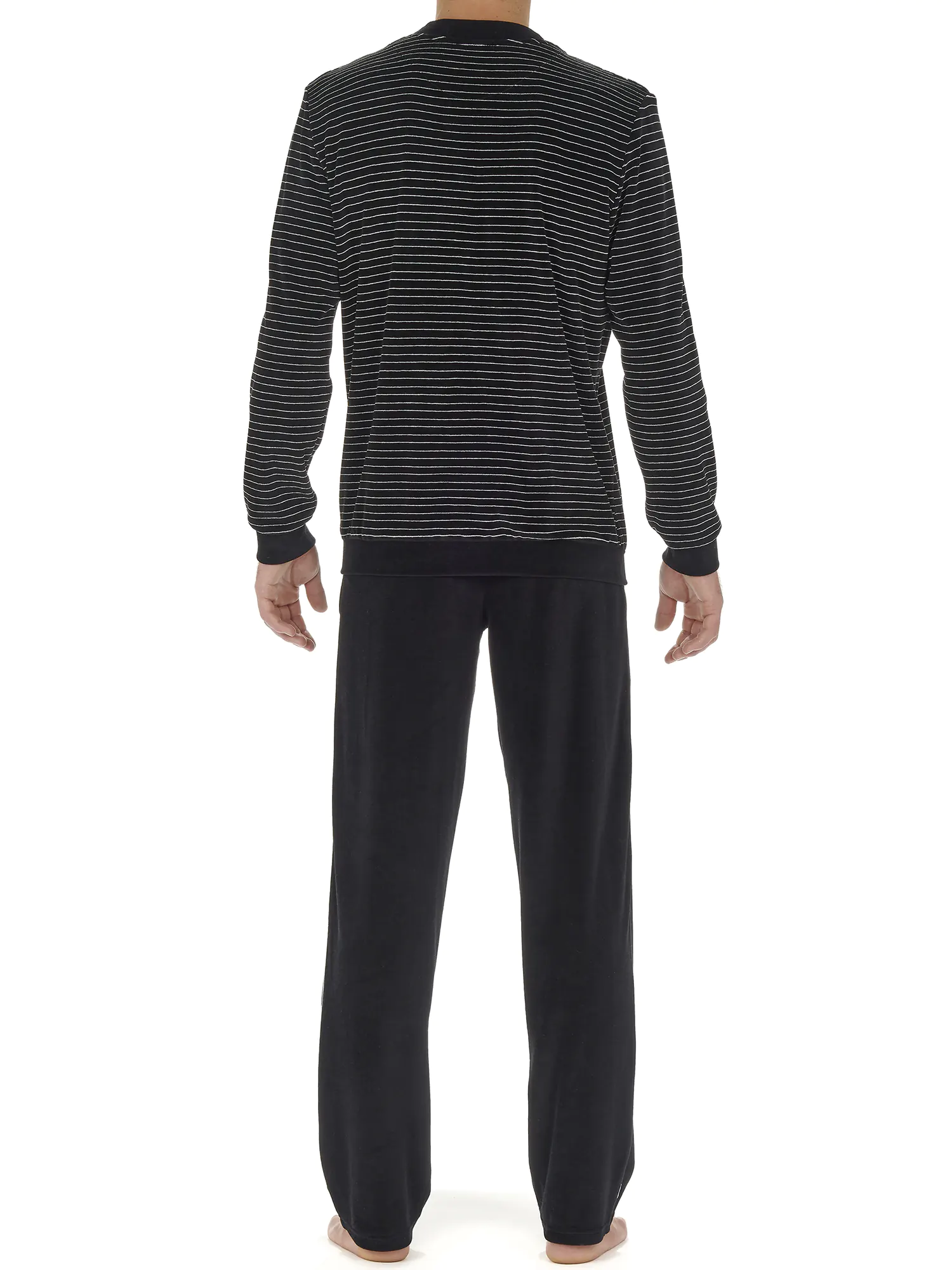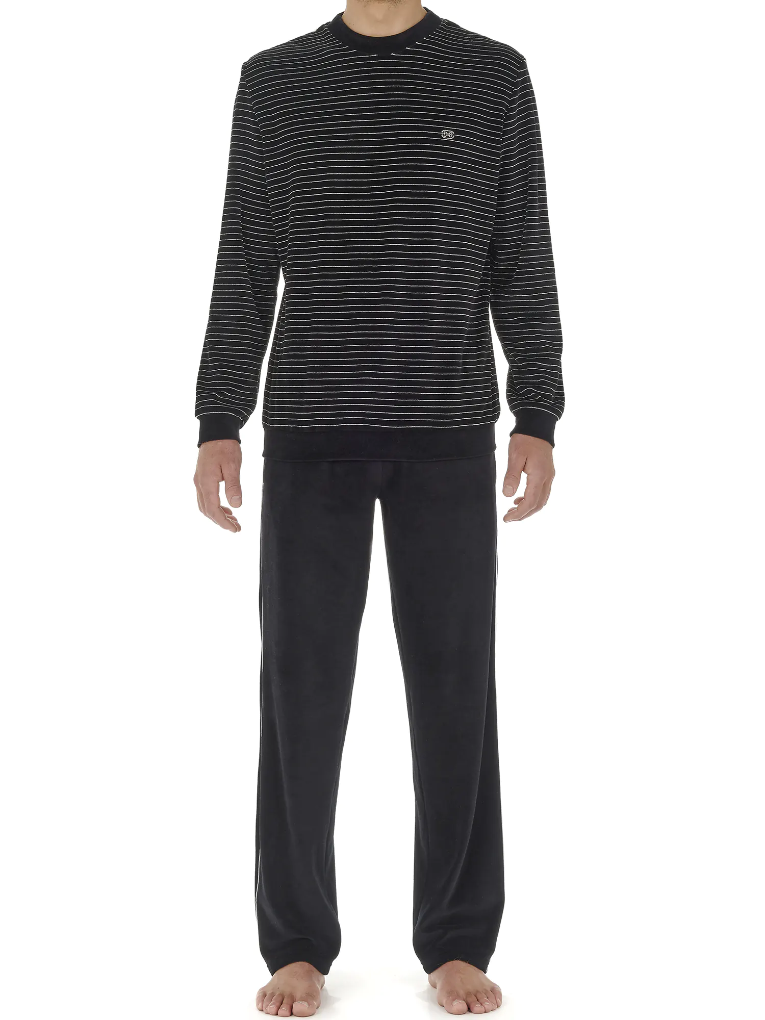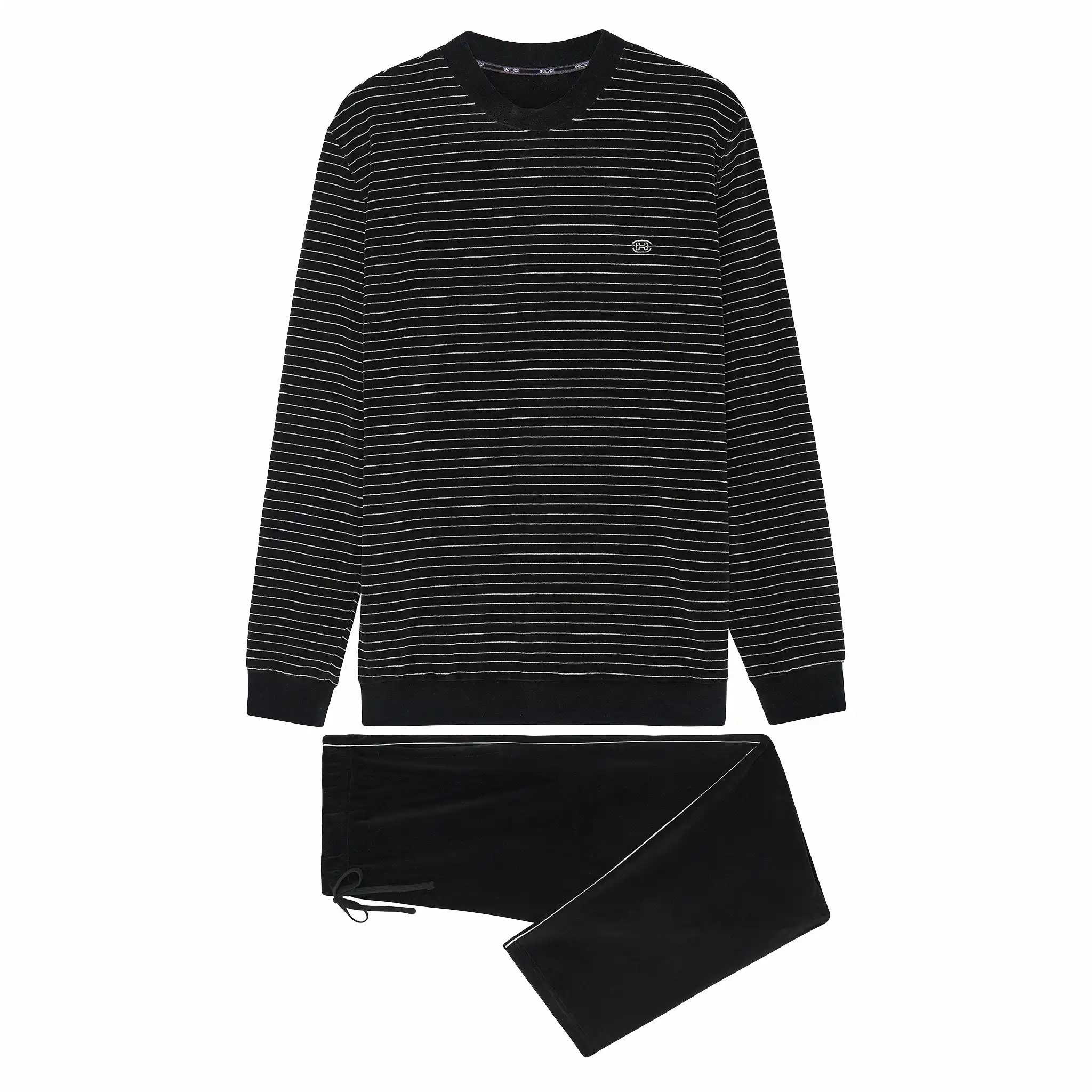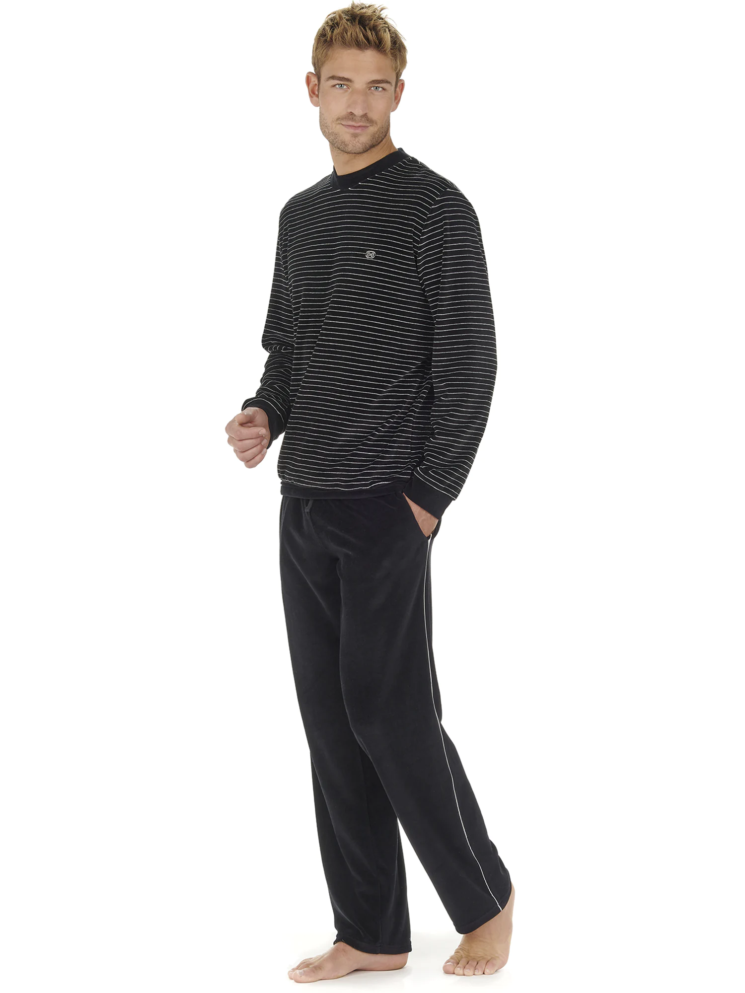De Norman is een huispak gemaakt van zacht velours katoen gemixt met polyester, waardoor het huispak een zachte touch heeft. Het pak bestaat uit een sweater met lange mouwen met een ronde hals en een effen broek. De afwerking van de sweater is functioneel met banden aan het einde van de mouwen en rondom de taille, zodat de warmte behouden blijft. De broek van deze indoor-set loopt losjes langs het been en heeft een elastische heupband voor een comfortabele fit. Langs het been loopt een verticale lijn voor een sportieve look. Aan de linker en rechterzijde van de broek vind je steekzakken en is de broek net als de top gemaakt van velours. Omdat het pak is gemaakt van een mix met katoen blijft de temperatuur comfortabel gereguleerd en is het pak makkelijk te reinigen.