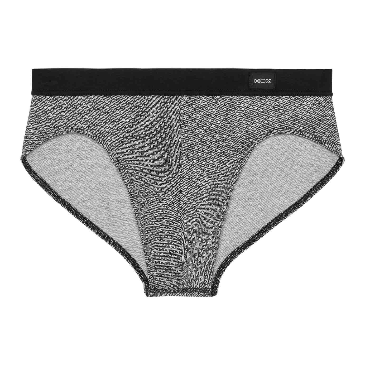 De Herbie - Comfort Mini Briefs is gemaakt van hoogwaardig katoenmodal en uitgevoerd met een comfort heupband, waarbij de stof is doorgetrokken en naar binnen is geslagen over de elastische band voor extra comfort. Deze heren mini slip beschikt over een print met diagonale geometrische patronen met illustraties van zwarte en witte golven. Linksvoor op de comfortband is een klein label van HOM geplaatst.