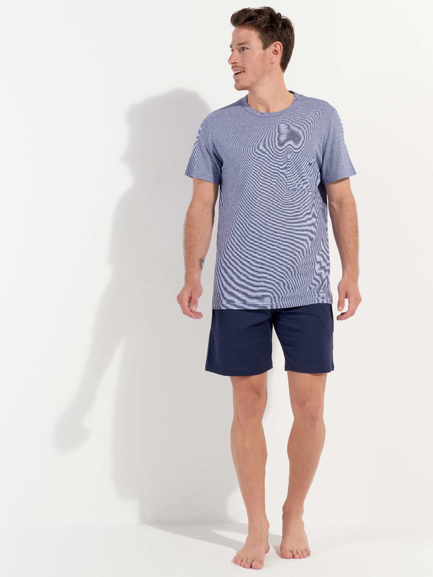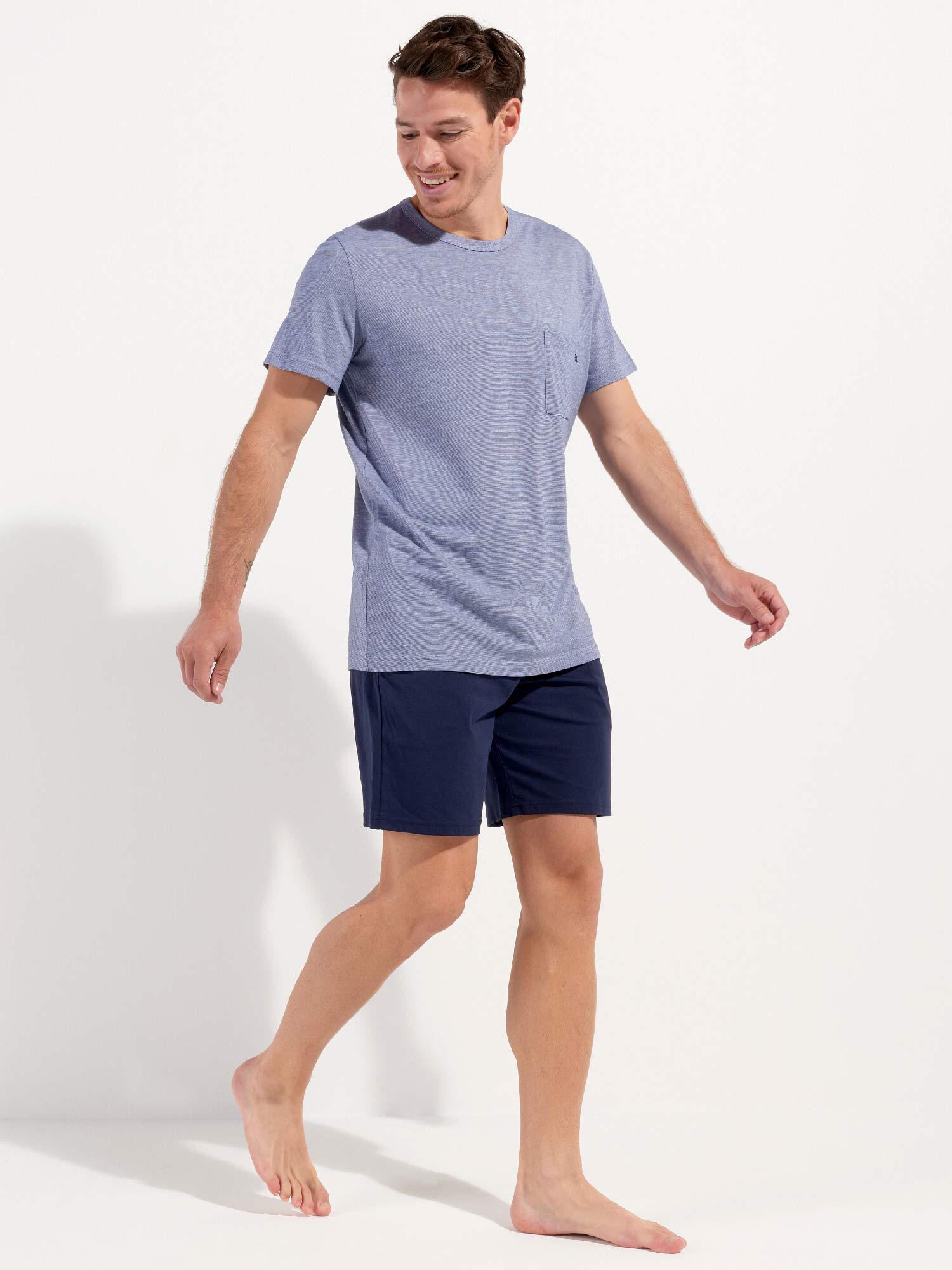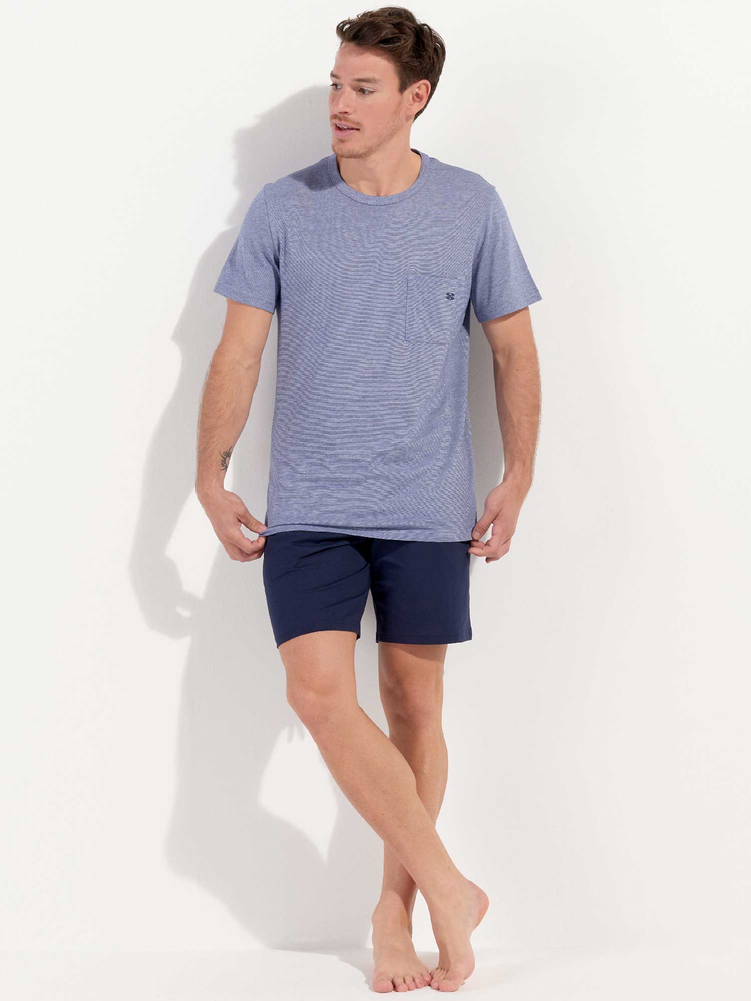 De Modal Comfort - Shortama is zoals de naam al aangeeft gemaakt van modal gemixt met katoen waardoor de pyjama extra zacht aanvoelt en comfortabel langs het lichaam valt. De pyjama beschikt over een T-shirt met een borstzakje en korte mouwen in gemêleerd blauw met een denim effect. De korte broek is effen uitgevoerd met steekzakken in de zoom, aan de linker en rechterzijde. De broek beschikt over een trekkoord om deze perfect op maat te brengen. Door de eenvoud heeft deze pyjama een tijdloze casual look.