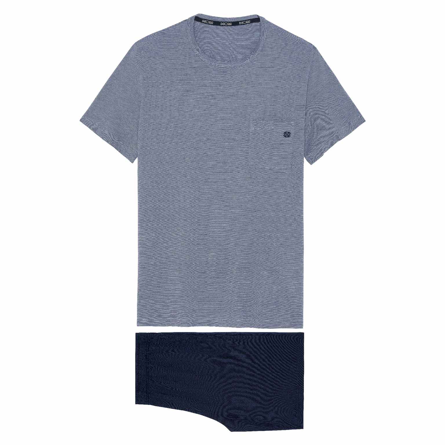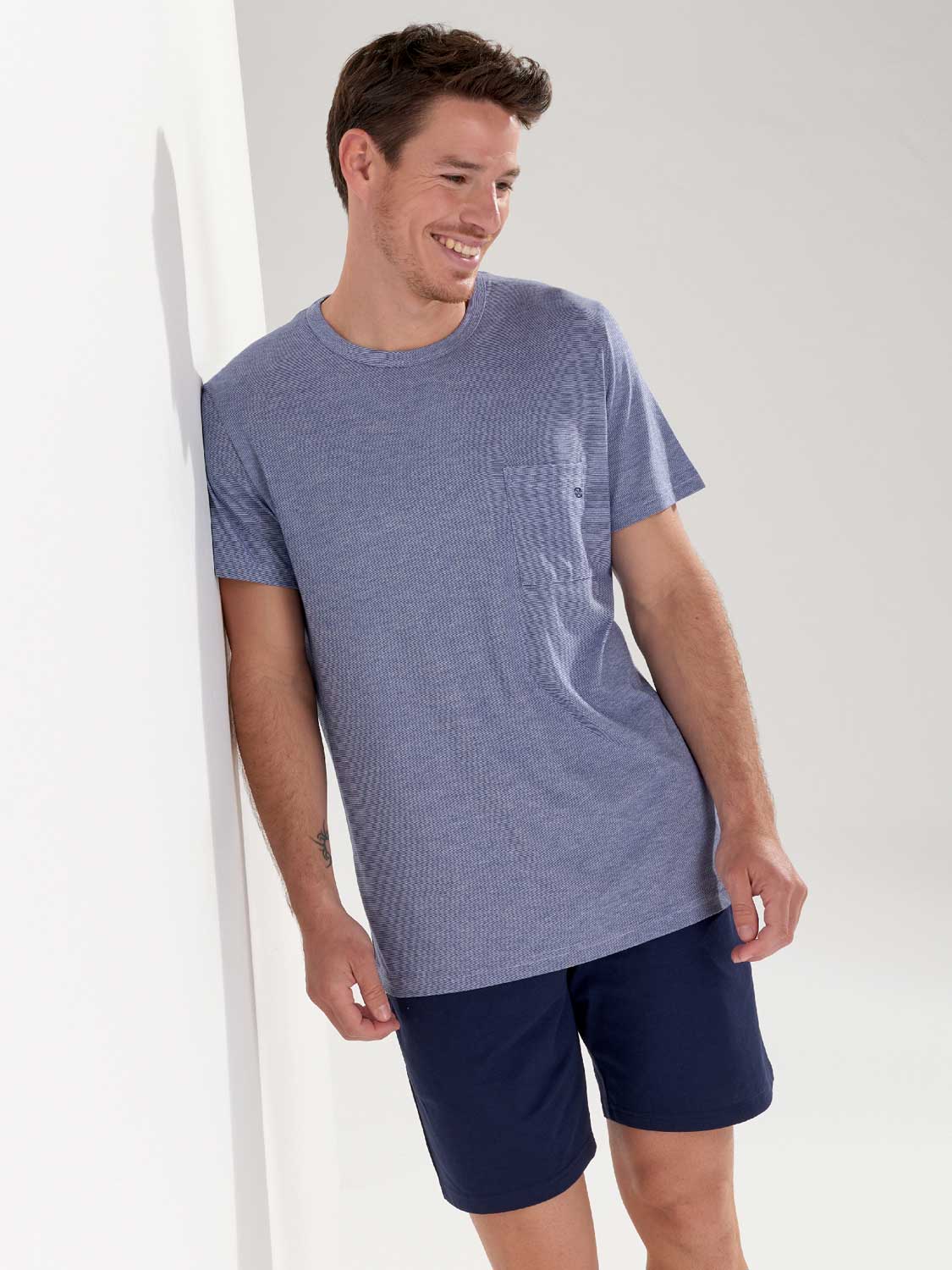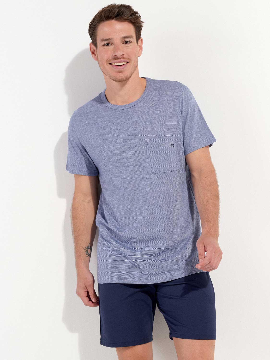 De Modal Comfort - Shortama is zoals de naam al aangeeft gemaakt van modal gemixt met katoen waardoor de pyjama extra zacht aanvoelt en comfortabel langs het lichaam valt. De pyjama beschikt over een T-shirt met een borstzakje en korte mouwen in gemêleerd blauw met een denim effect. De korte broek is effen uitgevoerd met steekzakken in de zoom, aan de linker en rechterzijde. De broek beschikt over een trekkoord om deze perfect op maat te brengen. Door de eenvoud heeft deze pyjama een tijdloze casual look.