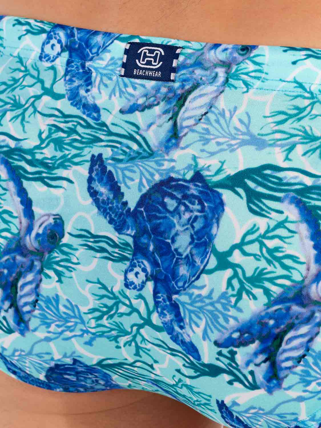 De Tartane - Swim Mini Briefs maken deel uit van de zomercollectie zwemkleding van HOM. Blauwe schildpadden op een turquoise achtergrond sieren dit waterachtige ontwerp dat doet denken aan de zeebodem rond de Caribische eilanden. De schildpad staat symbool voor wijsheid, moed en doorzettingsvermogen. De stof is elastisch, sluit mooi aan op de huid en is niet doorschijnend. Omdat dit mini briefs zijn, zitten ze hoger op de heupen. Het trekkoord in de tailleband zorgt ervoor dat je de zwembroek perfect kunt afstellen op jouw maat voor een stevige en comfortabele pasvorm.