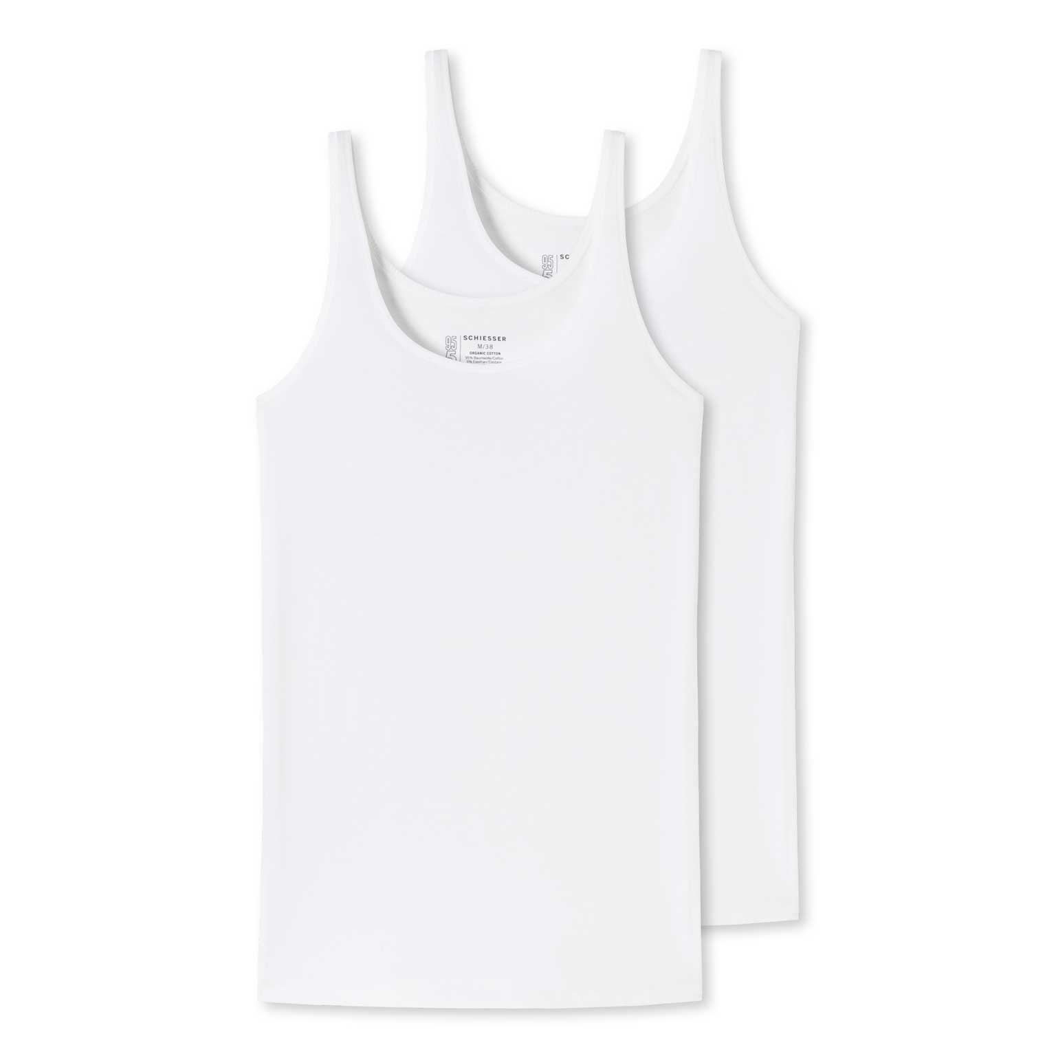 Een voordeelpack met 2 tops voor dames uit de populaire Schiesser "95/5" serie. De tops zijn gemaakt van zijdezacht biologisch katoen gemixt met 5% elastaan en gebreiden in een jersey, voor een optimale pasvorm en het beste draagcomfort. Door de speciale productie van Schiesser is het elastaan in de stof zodanig beschermd dat je de tops tot 60 graden kunt wassen zonder dat ze hun pasvorm verliezen. Met deze tops koop je de kwaliteit die je van Schiesser mag verwachten.