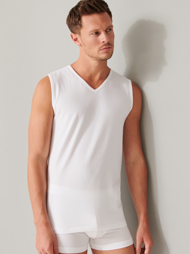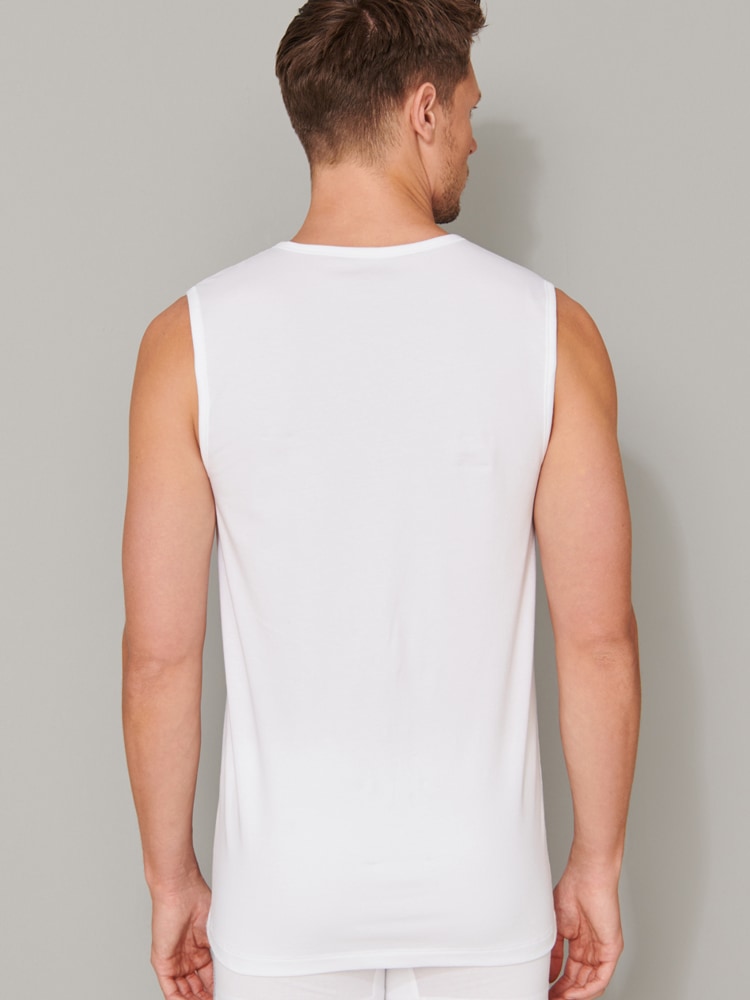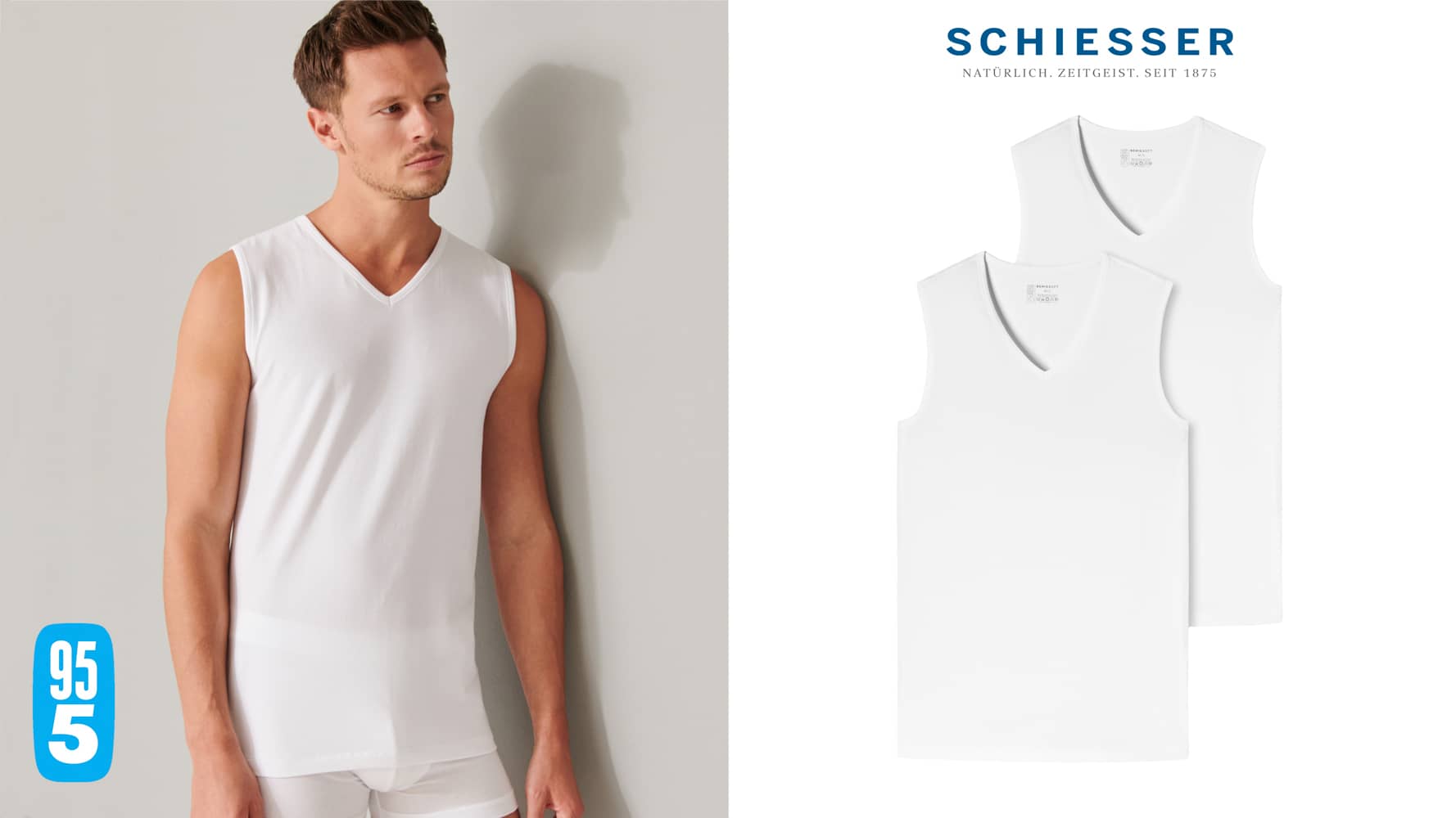 2 Tanktops voor de man in een dubbelpack, uit de populaire SCHIESSER-serie "95/5". De tanktops hebben een V-hals en zijn gemaakt van 95% natuurlijk biologisch katoen en 5% elastan, Ze zijn gebreid in een perfect passende elastische single jersey kwaliteit. De 95-5 tantkops kun je wassen op een temperatuur tot 60 graden.