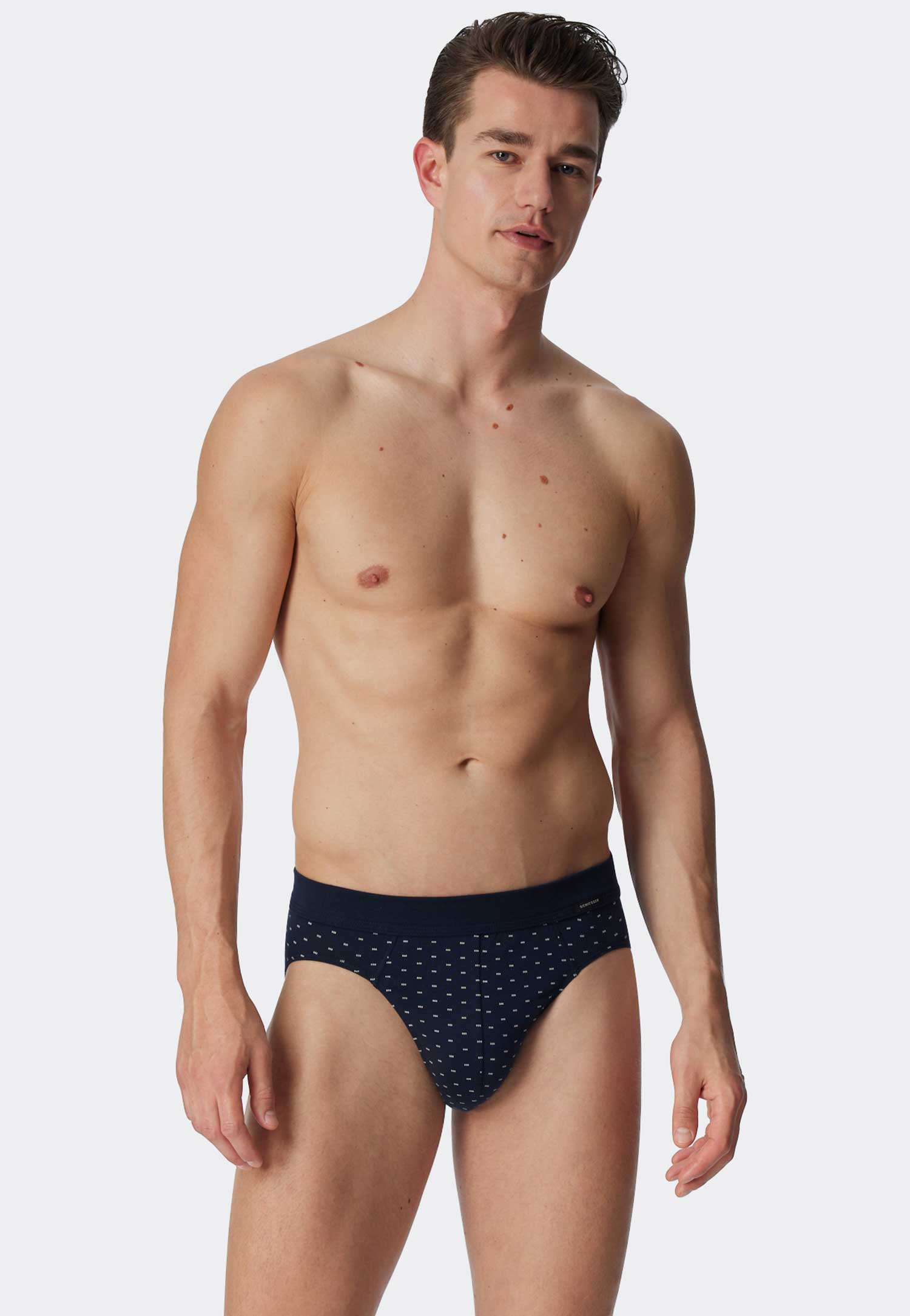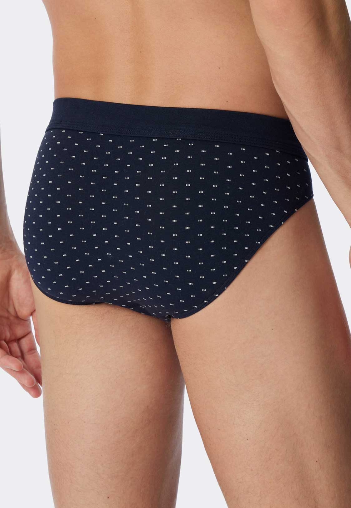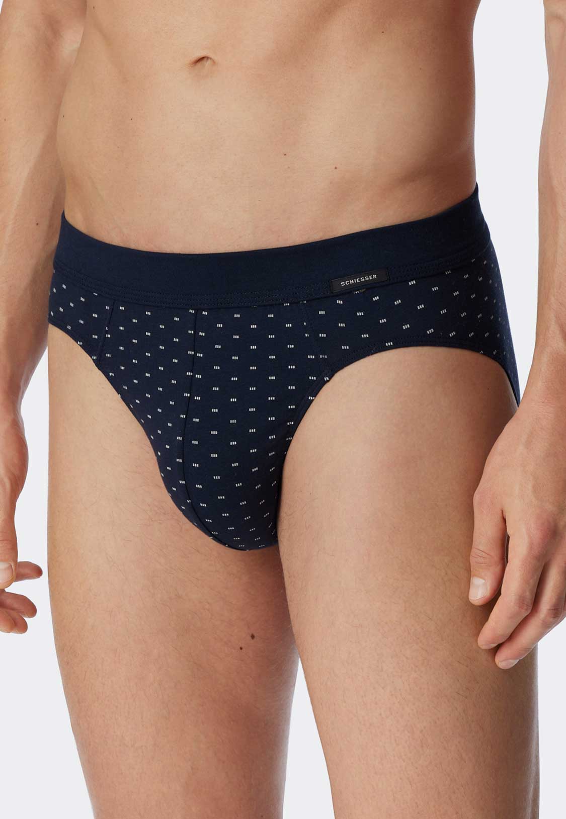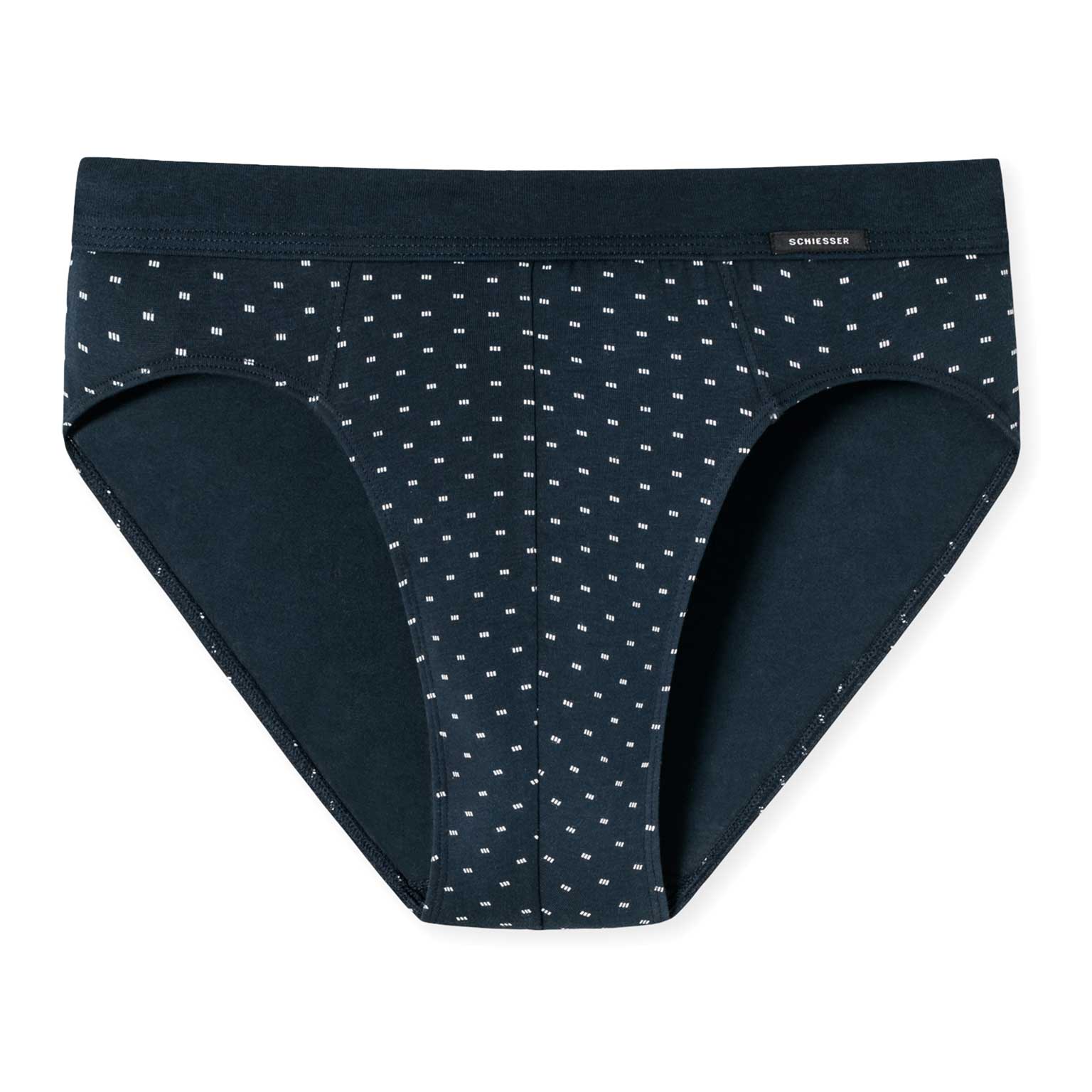Heren slip gemaakt van biologisch katoen uit de Daywear collectie van Schiesser verkrijgbaar in een zwartblauwe kleur. De slip heeft een print met een grafisch ontwerp. Doordat de slip is gemaakt van katoen, is deze makkelijk te reinigen en voelt deze aangenaam zacht. Uitgevoerd met een brede band met een klein labeltje met daarop het Schiesser logo.