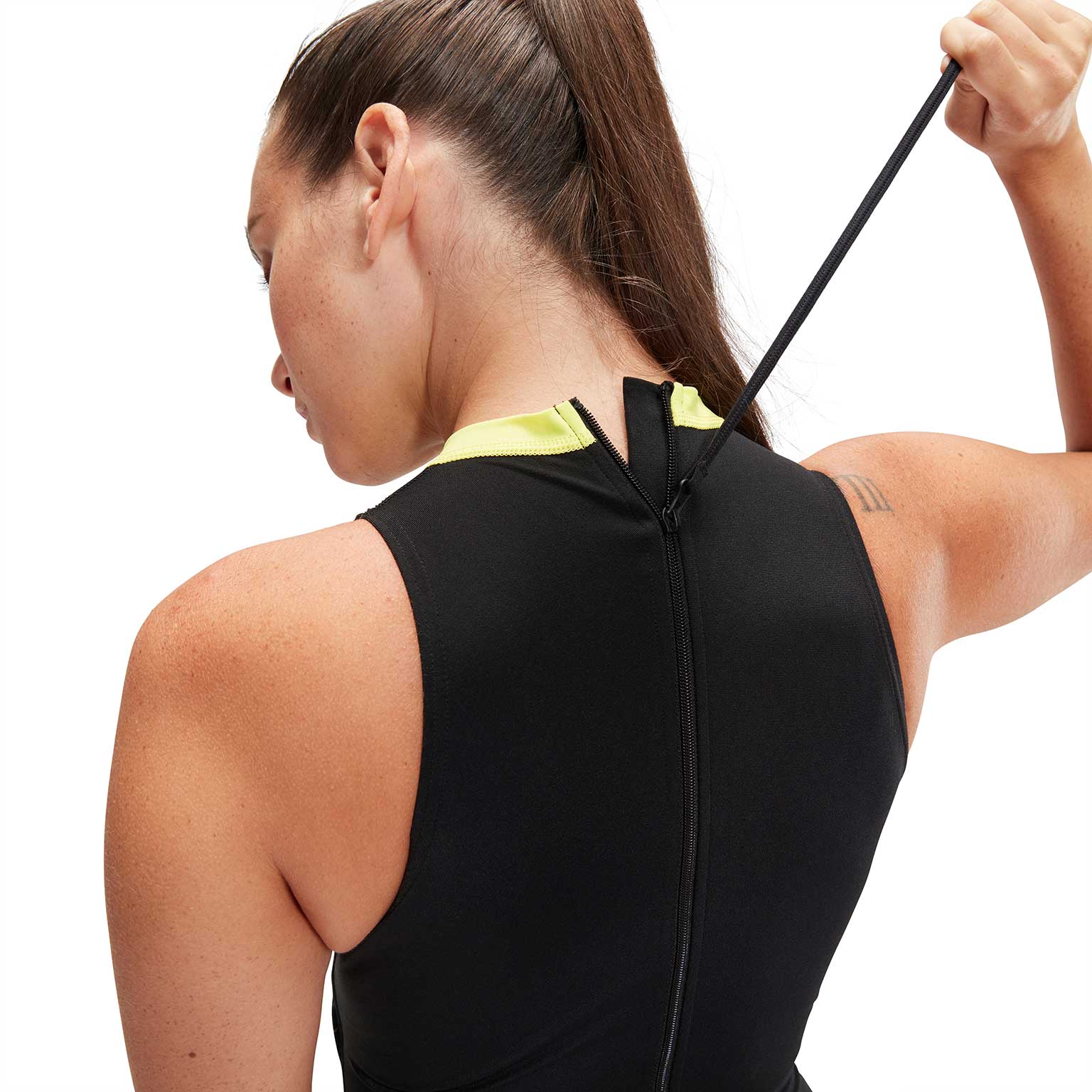 Het hydrasuit is een klassiek badpak wat zorgt voor extra lichaamsbedekking door de hoge neklijn en een volledig bedekte rug. De rug is voorzien van een rits met lang trekkoord om deze gemakkelijk open en dicht te maken. Het badpak heeft een lichte borstondersteuning zodat je met die badpak full body support ervaart. Het badpak is gemaakt van Eco Endurance+, wat chloorbestendig is, snel droogt en is gemaakt van gerecycled materiaal, waardoor deze vele malen langer mee gaat dan andere badstof kleding. Perfect voor dagelijks gebruik!
