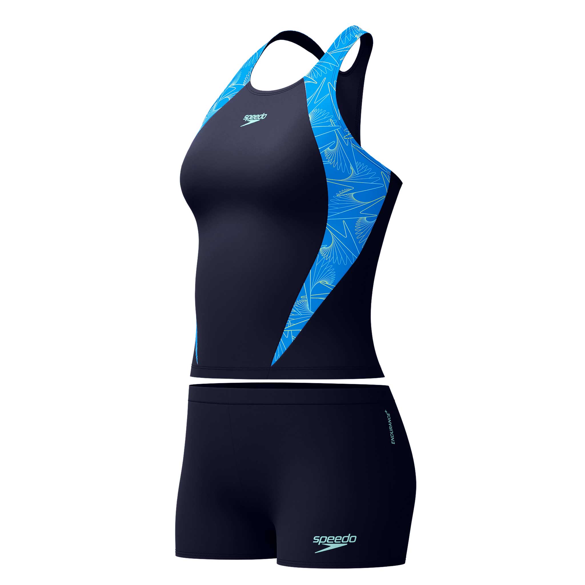 Maak een statement met deze prachtige tankini van Speedo. De Tankini heeft een Speedo Hyperboom print in turquoise met blauw. De Tankini is ideaal om in te sporten (denk aan aquajoggen of water aerobics). De schouders worden namelijk vrij worden gehouden en de top geeft een zacht support voor de buste voor extra comfort bij bewegingen in het water. Het shortje geeft meer bedekking dan een reguliere zwemslip en heeft een trekkoord aan de binnenzijde voor een verstevigde fit. De tankini is gemaakt van Endurance+ materiaal waardoor deze chloor afstotend is en deze langer mee gaat dan normale badkledingstof.